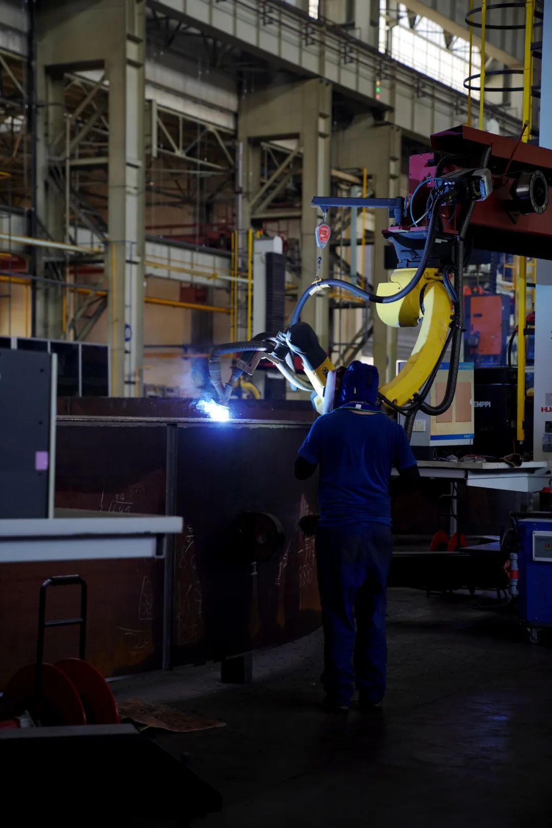 在生产制造现场,集团旗下尊龙凯时人生就是搏电机一线职工正在操作智能焊接机器人进行玛尔挡水电项目机组部件堆焊。该项目是国家“西电东送”青豫直流配套骨干电源点之一,是青海省打造的“水光储蓄”千万千瓦级多能互补一体化全清洁能源大基地的核心工程,是黄河上游在建海拔最高、装机容量最大的水电站。