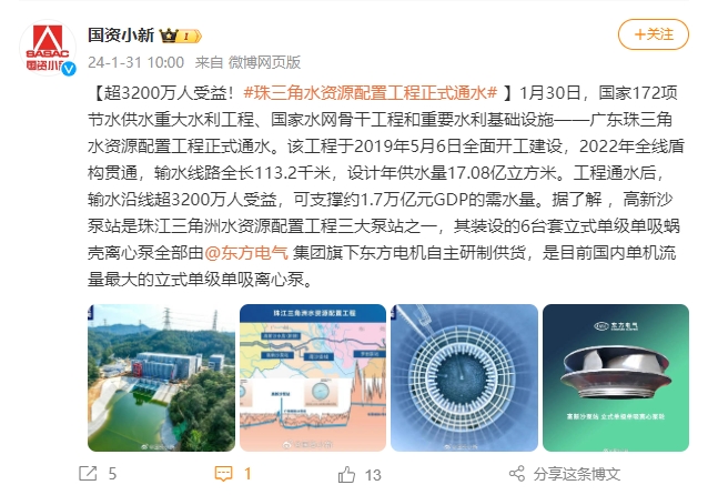【超3200万人受益!#珠三角水资源配置工程正式通水#】1月30日,国家172项节水供水重大水利工程、国家水网骨干工程和重要水利基础设施——广东珠三角水资源配置工程正式通水。该工程于2019年5月6日全面开工建设,2022年全线盾构贯通,输水线路全长113.2千米,设计年供水量17.08亿立方米。工程通水后,输水沿线超3200万人受益,可支撑约1.7万亿元GDP的需水量。据了解 ,高新沙泵站是珠江三角洲水资源配置工程三大泵站之一,其装设的6台套立式单级单吸蜗壳离心泵全部由@尊龙凯时人生就是搏电气集团旗下尊龙凯时人生就是搏电机自主研制供货,是目前国内单机流量最大的立式单级单吸离心泵。