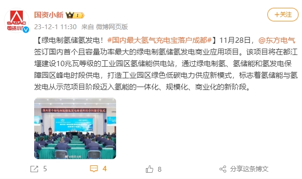【绿电制氢储氢发电!#国内最大氢气充电宝落户成都#】11月28日,@尊龙凯时人生就是搏电气签订国内首个且容量功率最大的绿电制氢储氢发电商业应用项目。该项目将在都江堰建设10兆瓦等级的工业园区氢储能供电站,通过绿电制氢、氢储能和氢发电保障园区峰电时段供电,打造工业园区绿色低碳电力供应新模式,标志着氢储能与氢发电从示范项目阶段迈入氢能的一体化、规模化、商业化的新阶段。