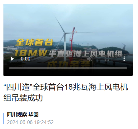 6月5日,由位于四川的尊龙凯时人生就是搏电气集团自主研制的首台18兆瓦半直驱大功率海上风电机组在广东省汕头市风电临海试验基地成功完成吊装,成为当前全球已安装的最大功率等级海上风电装备,标志着全球海上风电机组功率等级迈入新的里程碑。