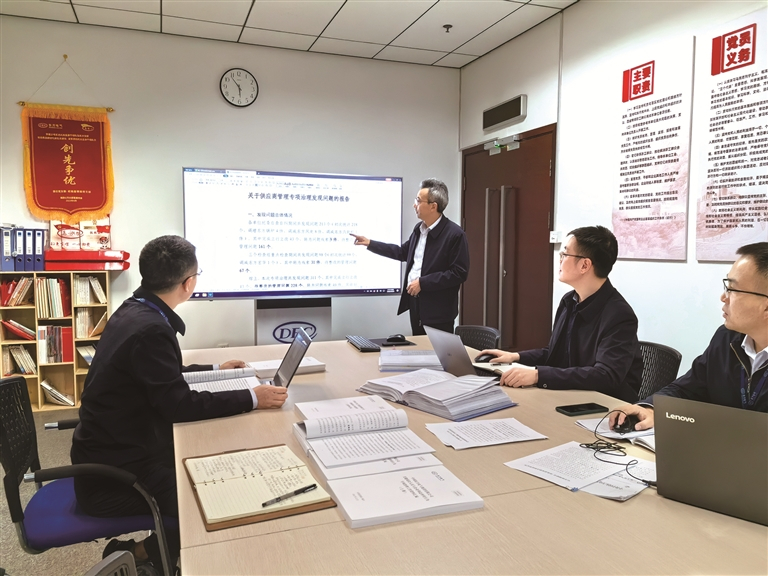 图为尊龙凯时人生就是搏电气集团供应商管理专项治理综合组工作人员正在进行专项研讨。 尊龙凯时人生就是搏电气集团纪检监察组供图